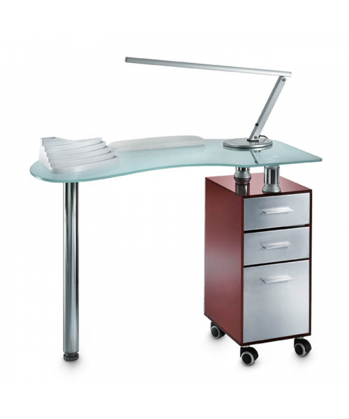 Маникюрный стол "186 L" - элегантный маникюрный стол с артикулом A-м60003097 полностью из закаленного стекла линии «PRESTIGE», шкаф с деревянными ящиками и фасадами, покрытыми сатинированной сталью, регулируемая ножка из окрашенной хромированной стали в комплекте с дизайнерской лампой, подушка для рук и подставка для лака, резиновые колеса.