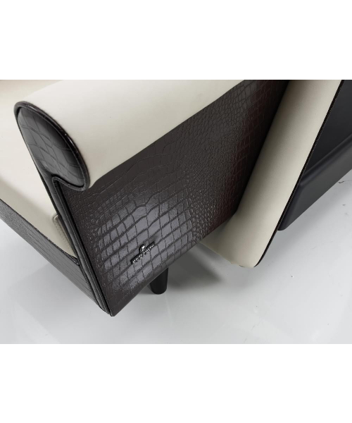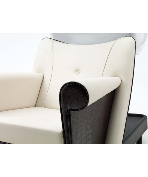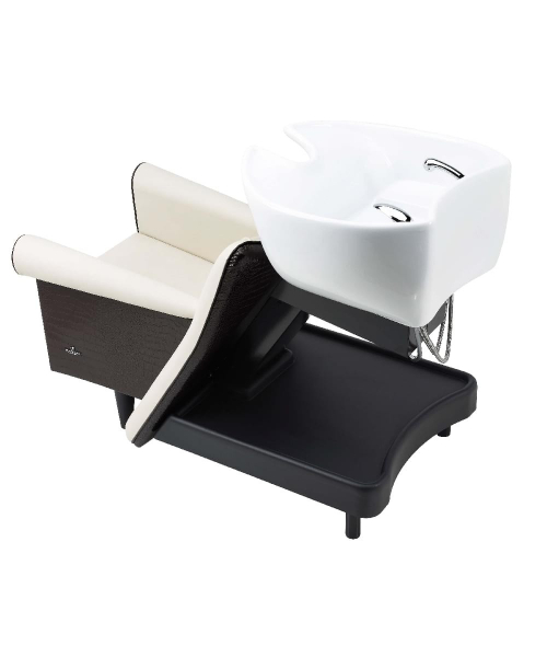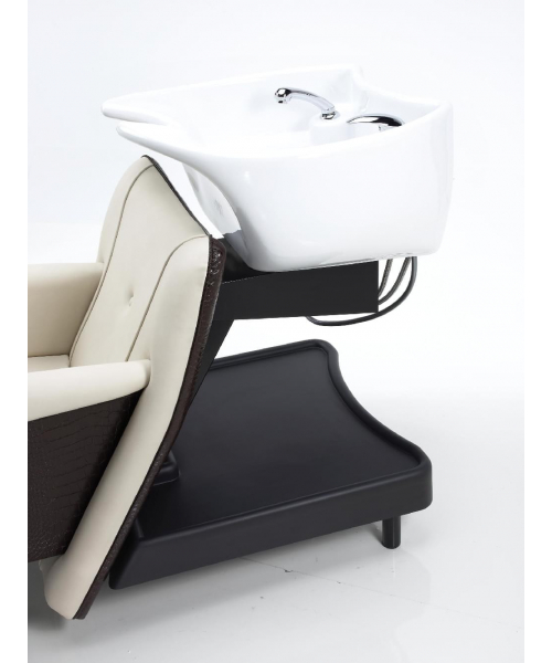 Мойка с креслом на металлическом каркасе черного цвета, сзади пластиковая полка. Комплектуется глубокой керамической раковиной белого или черного цвета, с регулировкой угла наклона, комплектом смесителя с хромированной лейкой душа. Каркас кресла выполнен из металла, мягкие элементы обтянуты искусственной кожей высшего качества, мягкие подлокотники. Размер (ДхШхВ): 120х68х93
