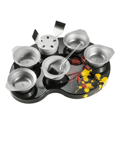 Тележка для окрашивания "PALETTE COLOR SPLASH" - тележка с артикулом A-м60003006 из пластика на колесах. Имеет 5 отделений под миски для окрашивания, 5 отделений под кисти и отделение для сопутствующих аксессуаров. Отличительной особенностью тележки является наличие декортаивного рисунка в виде кляксы.
