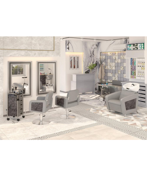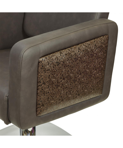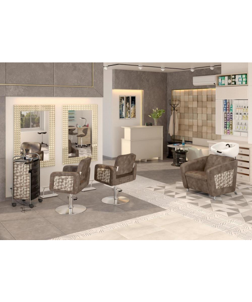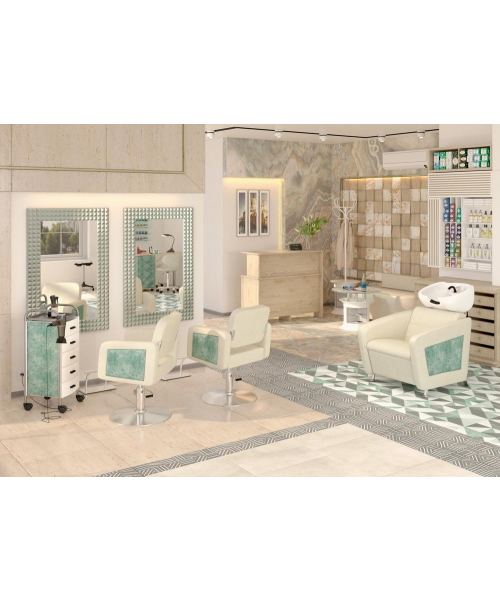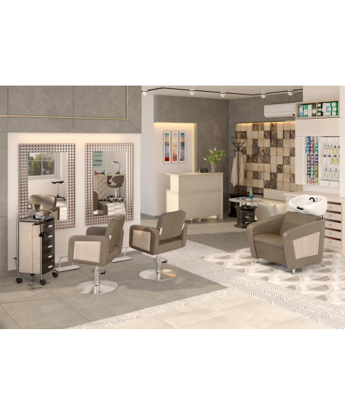 Удобное сидение с мягкой спинкой в сочетании с подлокотниками помогут обеспечить комфорт каждому клиенту. В качестве наполнителя применён плотный поролон, который не образует вмятин в течение длительного срока эксплуатации. Для обшивки использована прочная экокожа, устойчивая к разрывам, растягиванию и протиранию. Уход за поверхностью необычайно прост, потому что материал не впитывает влагу и грязь. Пыль с такой мебели можно удалить сухой текстильной салфеткой, а пятна от косметических продуктов стираются специальными моющими составами для кожи.
