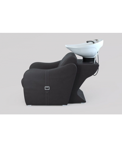 Подстраиваясь под клиента, раковина поднимается и опускается, принимая нужное положение. Стильное основание изготовлено с эргономичной спинкой и удобными мягкими подлокотниками, сиденье – широкое: все для того, чтобы клиенту было максимально комфортно. Боковая часть оформлена элегантным ремешком с пряжкой, по краю материал оформлен качественной строчкой – эти нюансы делают модель красивой и современной, моментально привлекая внимание посетителей.