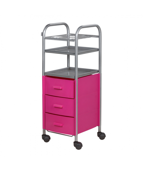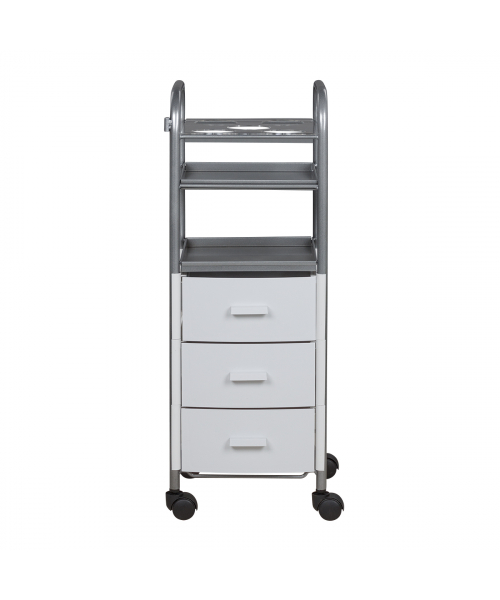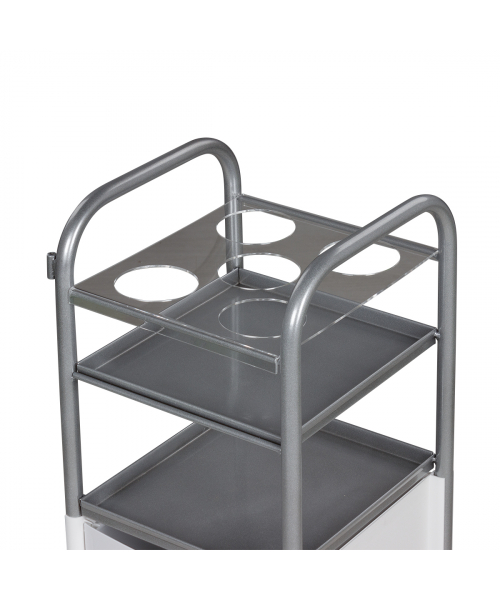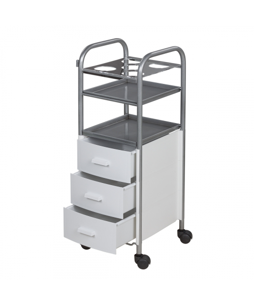 Для инструментов и расходных материалов в тележке предусмотрены три выдвижных ящика. Верхняя полка оснащена специальной панелью с отверстиями для высоких флаконов. Над ящиками есть еще одна практичная полка. Для быстрого и удобного перемещения по кабинету в конструкции предусмотрены маневренные колесики.