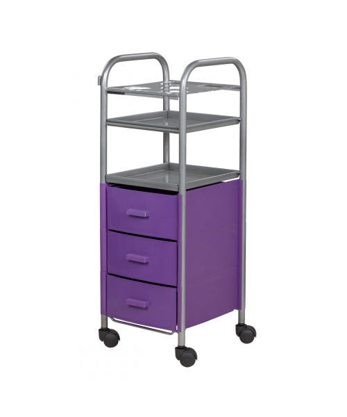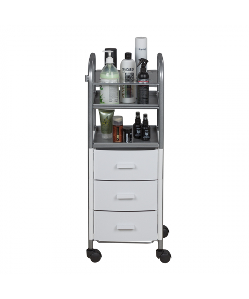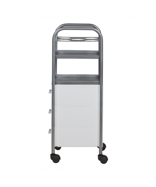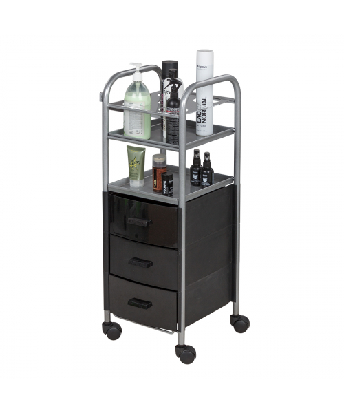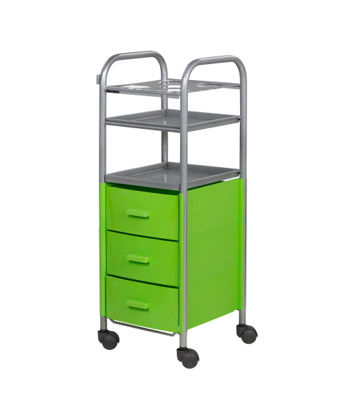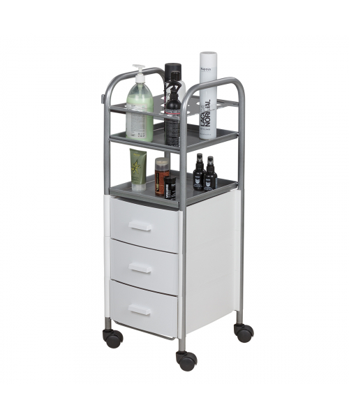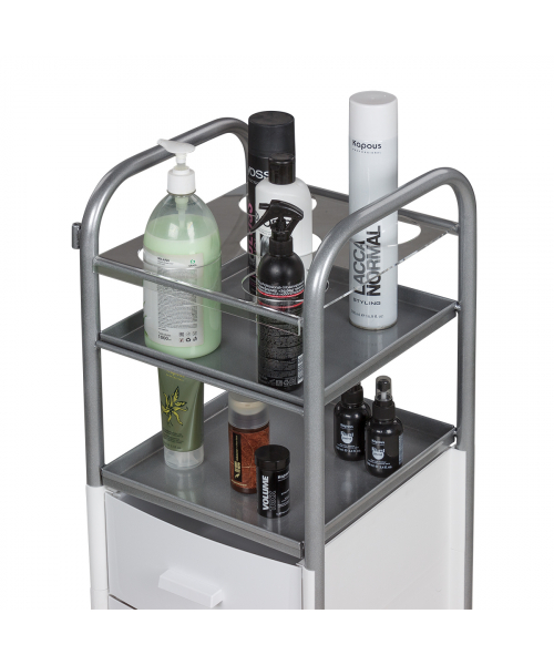 Каркас парикмахерской тележки выполнен из оцинкованной стали. Пластиковые колеса обеспечивают тихое перемещение оборудования и не царапают напольное покрытие. Полки выполнены из металла, устойчивого к воздействию дезинфицирующих и косметических средств. Ящики и боковые стенки изготовлены из ударопрочного пластика.